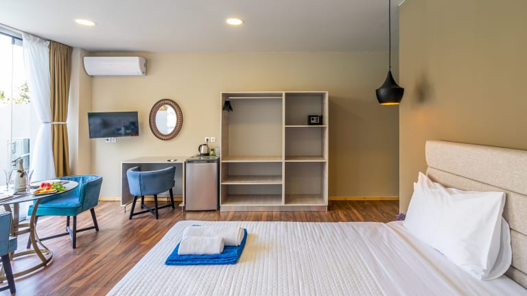 Die klimatisierten Zimmer im Bamboo Suites Hotel sind komfortabel eingerichtet und bieten alles, was Sie für einen angenehmen Aufenthalt benötigen. Zur Ausstattung gehören ein Schreibtisch, ein Wasserkocher, eine Minibar, ein Safe, ein Flachbild-TV und ein eigenes Bad mit Dusche. Jedes Zimmer verfügt zudem über eine Terrasse, auf der Sie die warmen Abende genießen können. Bettwäsche und Handtücher werden gestellt.