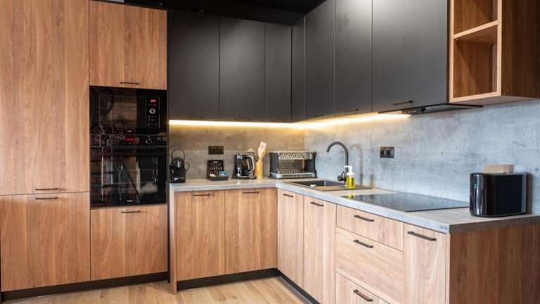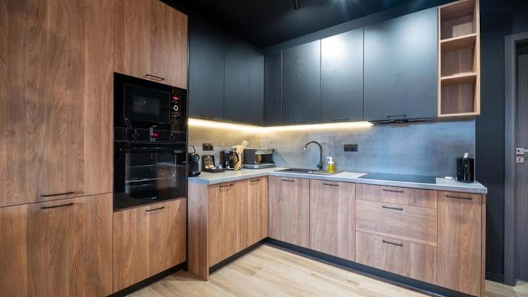 Die Einheit verfügt über eine Küche, die mit einem Kühlschrank, einem Geschirrspüler und einer Herdplatte ausgestattet ist. Es gibt Sitzplätze und einen Essbereich in den Wohneinheiten.