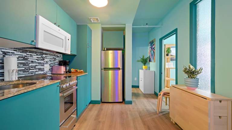 Jede Wohneinheit ist mit einer Küche ausgestattet, die einen Kühlschrank, eine Mikrowelle, eine Herdplatte, eine Kaffeemaschine und einen Wasserkocher umfasst.