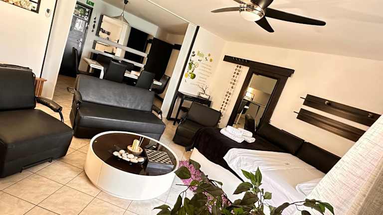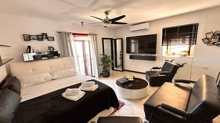 Die Ferienwohnung verfügt über ein Schlafzimmer, ein Badezimmer sowie einen Essbereich. Zur weiteren Ausstattung gehören Bettwäsche, Handtücher, ein Flachbild-TV mit Satellitenkanälen, eine voll ausgestattete Küche und eine Terrasse mit Stadtblick. Zusatzleistungen wie Handtücher und Bettwäsche sind gegen Aufpreis verfügbar.