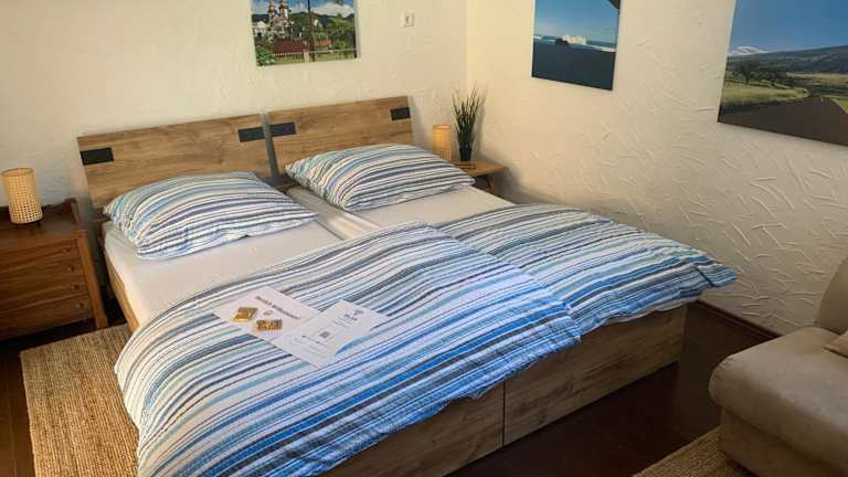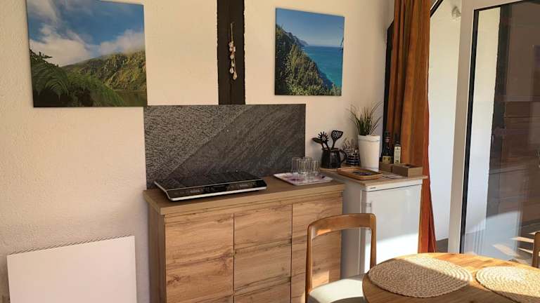 Die Ferienwohnung verfügt über ein Schlafzimmer, eine Küchenzeile mit Kühlschrank und Herdplatte, einen Flachbild-TV sowie einen Sitzbereich. Ein Badezimmer mit Dusche ist ebenfalls vorhanden. Handtücher und Bettwäsche werden bereitgestellt.