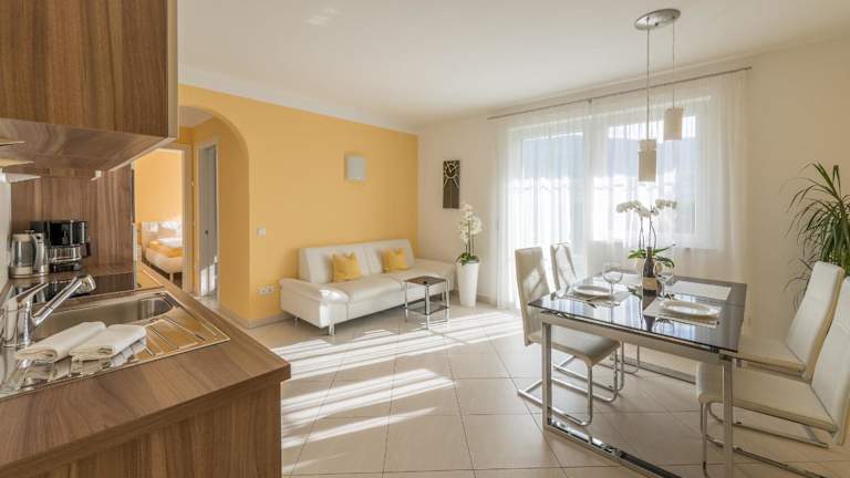 Im Quellenhof können Sie Ihre eigenen Mahlzeiten zubereiten und diese im Sitzbereich oder auf der Terrasse genießen. Die voll ausgestattete Küche bietet alle notwendigen Geräte und Utensilien, um Ihre Lieblingsgerichte zuzubereiten. Alternativ können Sie auch die nahegelegenen Restaurants besuchen und die lokale Küche genießen.