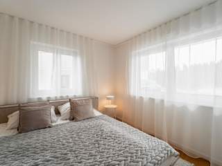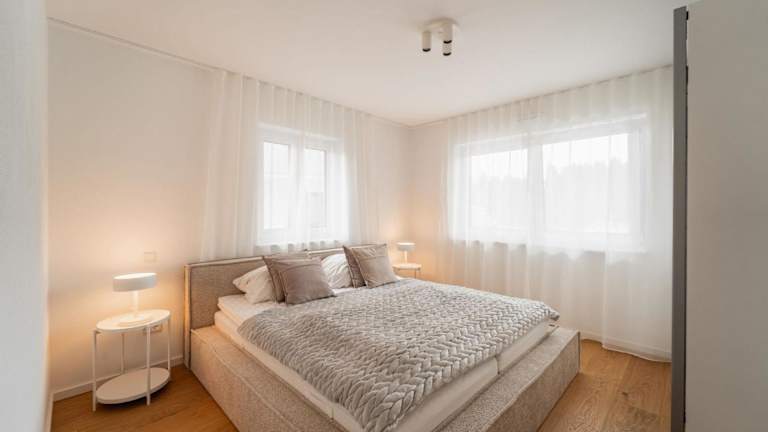 Die Ferienwohnung verfügt über zwei Schlafzimmer, eine Küchenzeile mit Kühlschrank und Geschirrspüler sowie zwei Badezimmer, die jeweils mit Dusche, Haartrockner und Waschmaschine ausgestattet sind. Zur Unterhaltung steht ein TV zur Verfügung.