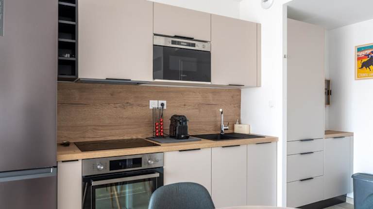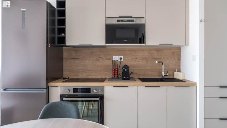 Die Ferienwohnung umfasst ein Schlafzimmer, ein Wohnzimmer und eine voll ausgestattete Küche mit Kühlschrank und Wasserkocher. Zudem bietet sie ein Badezimmer mit Dusche und Haartrockner. Zur Ausstattung gehört ein TV, der den Gästen zusätzliche Unterhaltung bietet.