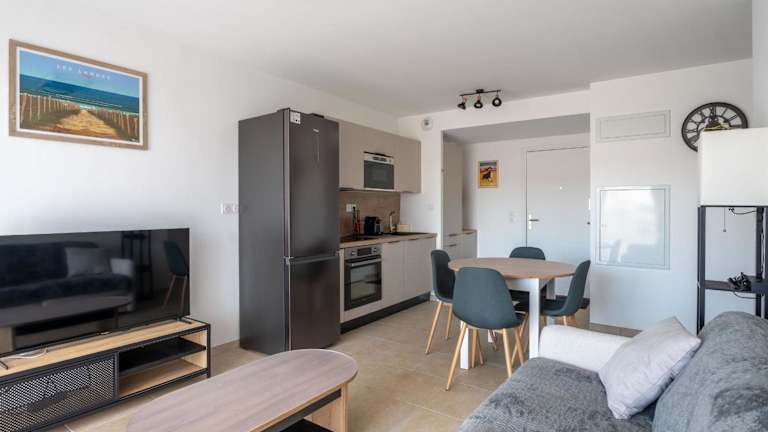 Beau T2 Neuf avec Jardinet, Parking et WIFI à Mimizan - FR-1-50-153 bietet eine moderne Ferienwohnung mit einer Terrasse. Die Unterkunft ist rauchfrei und gestaltet, um den Bedürfnissen von Gästen gerecht zu werden, die eine entspannte und komfortable Aufenthaltserfahrung suchen. Es stehen ein kostenloser Privatparkplatz und kostenfreies WLAN zur Verfügung.