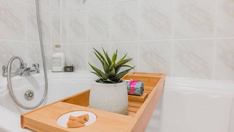 Die Ferienwohnung umfasst zwei Schlafzimmer, ein Wohnzimmer und ein Badezimmer, das mit einem Haartrockner und einer Badewanne ausgestattet ist.