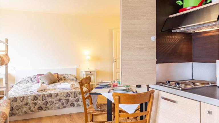 Die Ferienwohnung verfügt über 1 Schlafzimmer, ein Wohnzimmer sowie eine voll ausgestattete Küche mit Kühlschrank und Ofen.