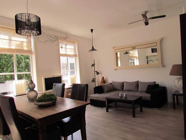 Die Ferienwohnung umfasst zwei Schlafzimmer sowie ein Wohnzimmer, ausgestattet mit einem Flachbild-TV und Satellitenkanälen. Des Weiteren ist eine voll ausgestattete Küche mit Kühlschrank und Ofen vorhanden. Das Badezimmer ist mit einer Dusche ausgestattet, und Handtücher sowie Bettwäsche werden bereitgestellt.