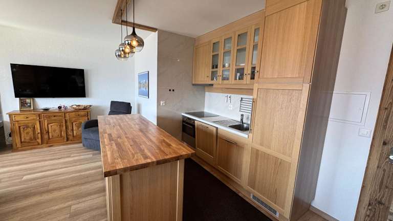 Die Ferienwohnung bietet ein Schlafzimmer, ein Wohnzimmer, eine gut ausgestattete Küche und einen Flachbild-TV. Ein Balkon und eine Terrasse sind ebenfalls vorhanden.