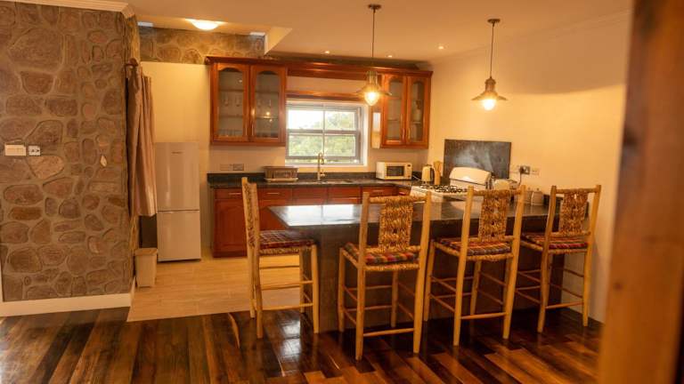 Eine voll ausgestattete Küche ist in der Unterkunft vorhanden, die mit Kühlschrank, Ofen, Mikrowelle, Herdplatte und Toaster ausgestattet ist. Zudem stehen eine Kaffeemaschine und ein Wasserkocher zur Verfügung. Eine Lebensmittellieferung ist gegen zusätzliche Gebühren möglich.