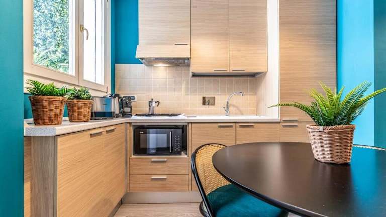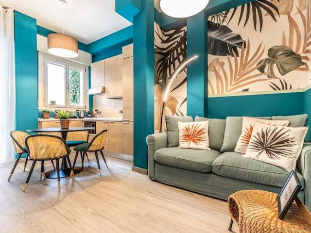 Die Ferienwohnung umfasst ein Schlafzimmer, ein Wohnzimmer sowie eine voll ausgestattete Küche mit Kühlschrank und Kaffeemaschine. Das Badezimmer ist mit einem Bidet und einer Dusche ausgestattet. Handtücher und Bettwäsche werden bereitgestellt.