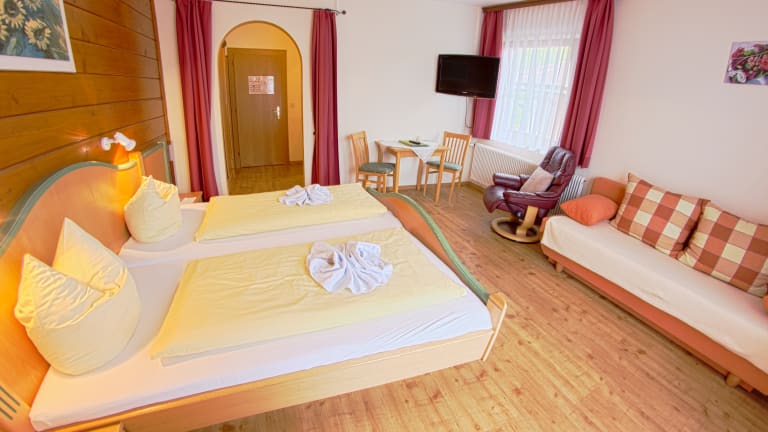 Familienzimmer mit getrennten Schlafräumen, Doppelzimmer, Dreibettzimmer oder Einzelzimmer. Ferienwohnungen bzw. Apparments.