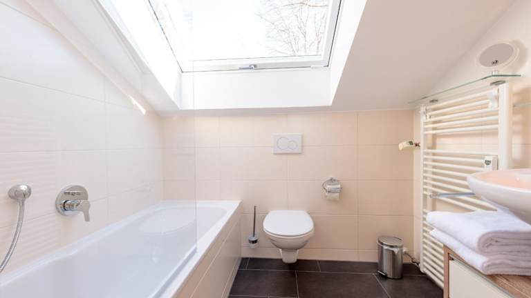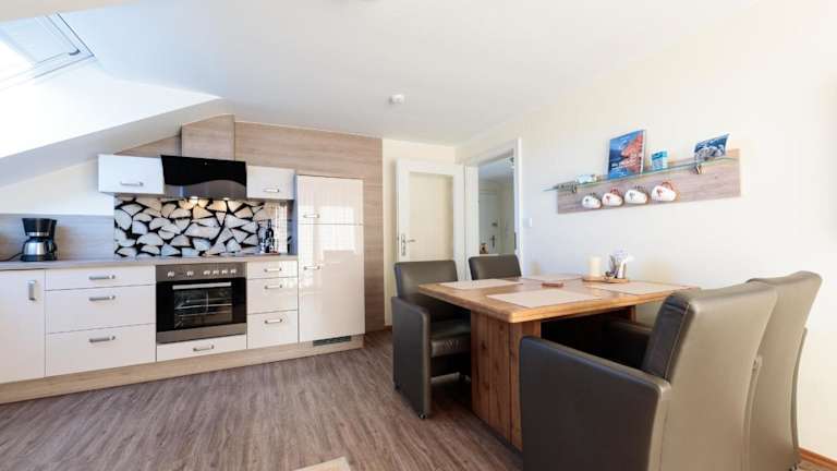 Die Ferienwohnung umfasst ein Wohnzimmer mit Sitz- und Essbereich, eine Küche ausgestattet mit Kühlschrank, Geschirrspüler und Ofen, zwei Schlafzimmer sowie ein Badezimmer mit Dusche und Badewanne. Handtücher und Bettwäsche werden bereitgestellt.