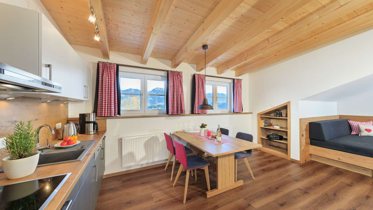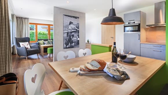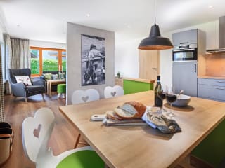 Alle Ferienwohnungen sind im modernen alpinen Stil, mit hochwertigen Materialien und mit viel Liebe zum Detail eingerichtet. Austattung Ferienwohnung: Küche komplett ausgestattet mit kombiniertem Backofen und Mikrowellengerät, Cerankochfeld, Geschirrspülmaschine, Wasserkocher, Filter-Kaffeemaschine und Toaster. W-LAN, Schlafzimmer mit extra hohen Komfortbetten (180 x 200). Bad mit Waschtisch, Dusche, Handtuchtrockner und Fön. Allgemeine Austattung im Haus: Ski- und Fahrradkeller mit Schuhtrockner, Waschmaschine und Trockner mit Münzeinwurf, Staubsauger, Parkplätze am Haus, Babybetten und Kinderhochstuhl.