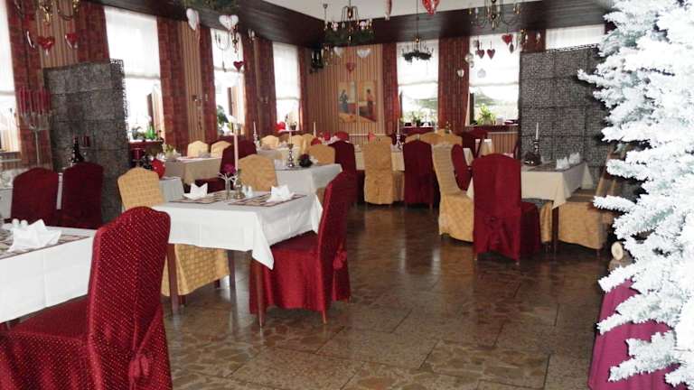 Hier wird Genießen zum Erlebnis. An gepflegter Tafel servieren wir Wildspezialitäten, saisonale und hausgemachte Thüringer Köstlichkeiten, und zu genussvolennen Stunden laden ein herrlicher Biergarten und eine Sonnenterrasse ein. Betriebs- und Familienfeiern sowie Seminare betreut unser professioneller Service in individuellen Räumen.