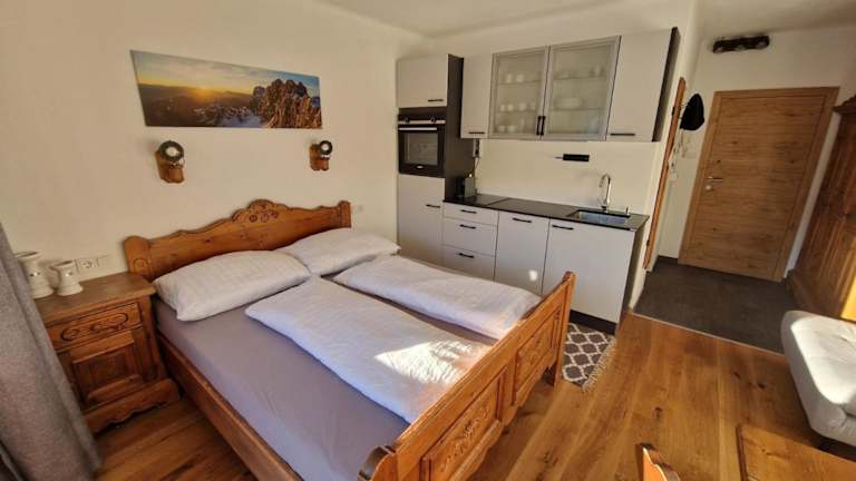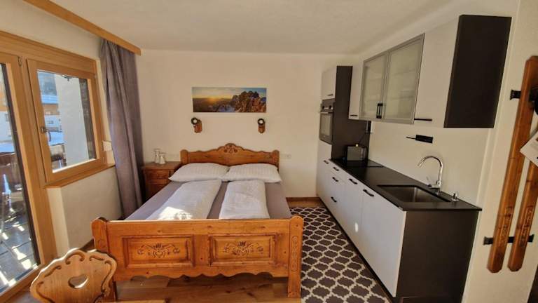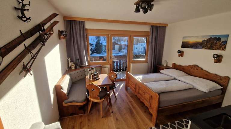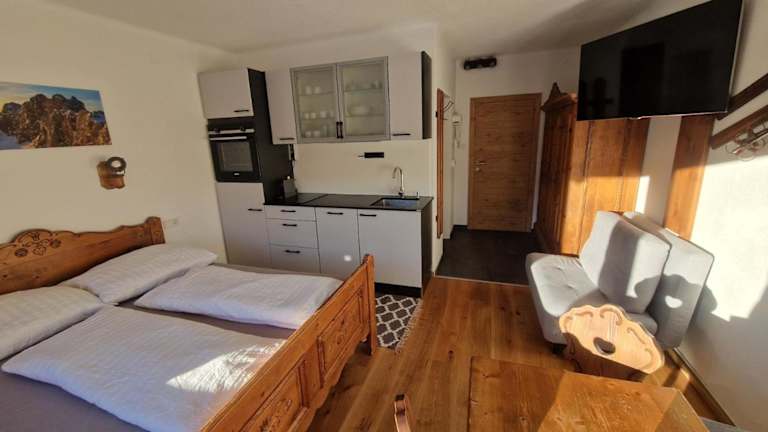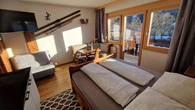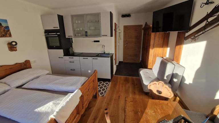 Die Ferienwohnung verfügt über 1 Schlafzimmer und 1 Badezimmer. Zur Ausstattung gehören Bettwäsche, Handtücher, ein Flachbild-TV mit Satellitenkanälen, ein Essbereich sowie eine voll ausgestattete Küche. Ein Balkon mit Blick auf die Berge ergänzt das Raumangebot.