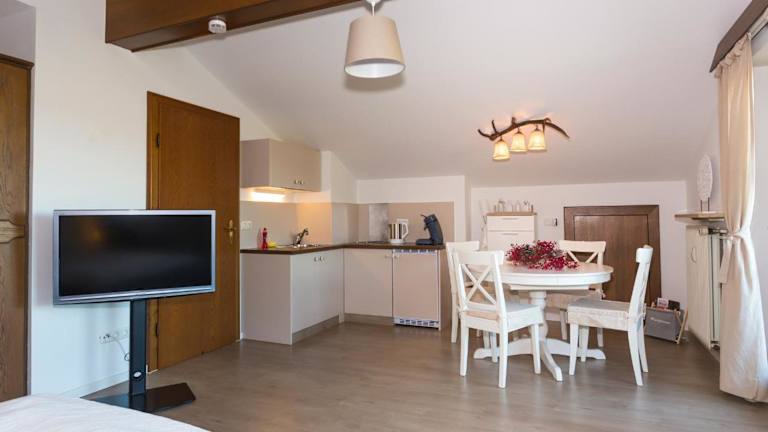 Die Ferienwohnung verfügt über ein Schlafzimmer und ein Badezimmer. Zur Ausstattung gehören Bettwäsche, Handtücher, ein Flachbild-TV mit Satellitenkanälen, ein Essbereich sowie eine voll ausgestattete Küchenzeile. Ein Balkon mit Bergblick ergänzt die Ausstattung der Unterkunft.