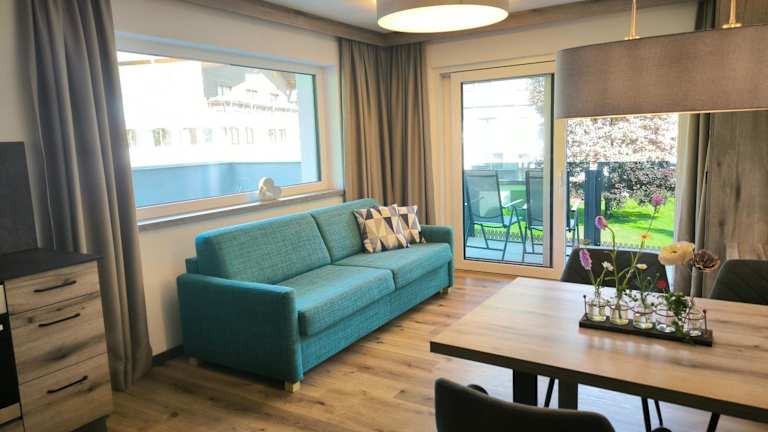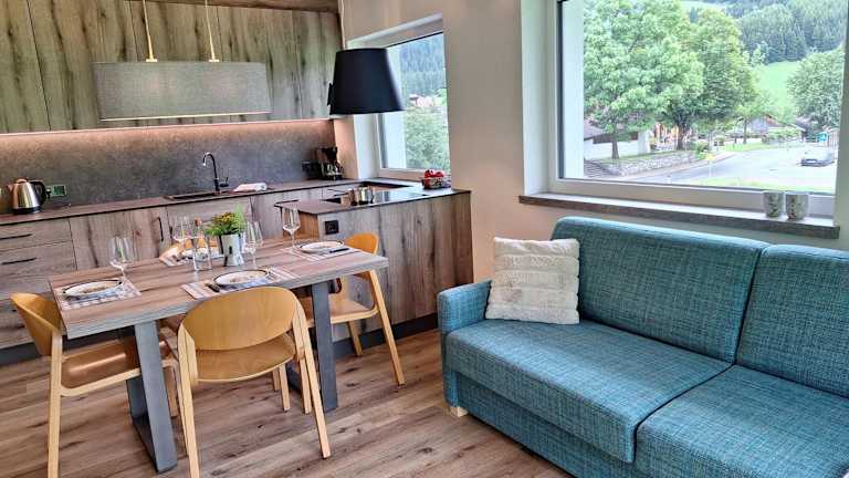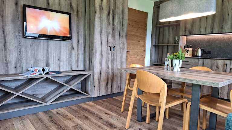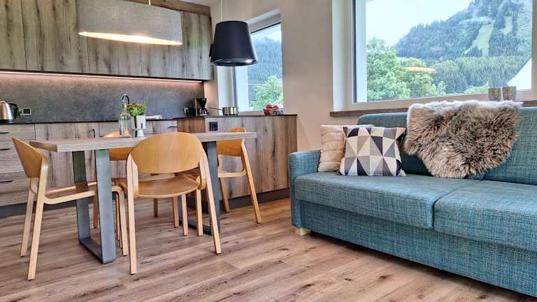 Die Apartments verfügen über einen Balkon mit Bergblick sowie einen Sitzbereich. Zur Ausstattung gehören ein Flachbild-TV und eine voll ausgestattete Küche, die mit einem Kühlschrank und einem Geschirrspüler eingerichtet ist. Ein eigenes Badezimmer mit Dusche und Haartrockner ist ebenfalls vorhanden.
