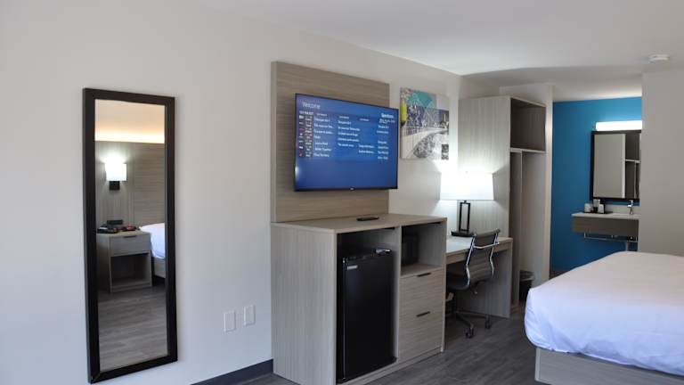 Die Zimmer im Best Western Greenville Airport sind komfortabel und bieten alle Annehmlichkeiten, die Sie für einen entspannten Aufenthalt benötigen. Jedes Zimmer verfügt über kostenloses WLAN, einen Flachbild-Kabel-TV, einen kleinen Kühlschrank, eine Mikrowelle und ein eigenes Badezimmer mit kostenfreien Pflegeprodukten. Die Zimmer sind mit Parkettboden und dunklen Holzmöbeln ausgestattet und bieten eine gemütliche Atmosphäre.