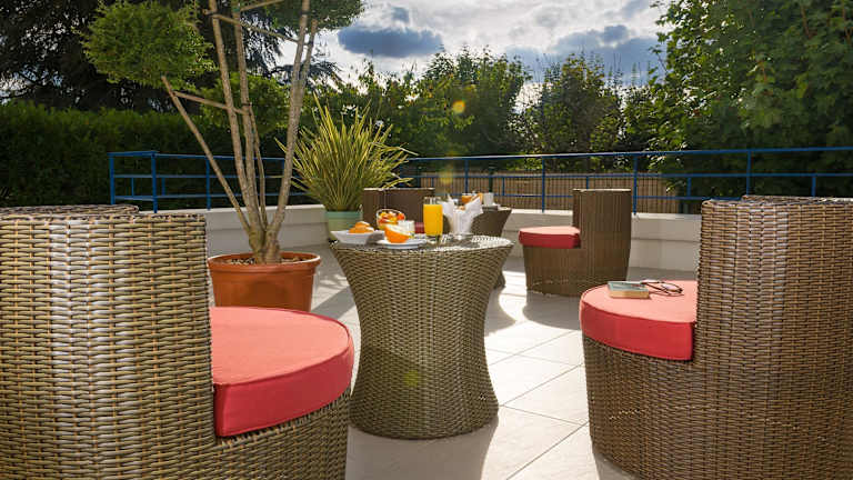 Die Terrasse des Hotels lädt die Gäste ein, das schöne Wetter zu genießen und sich zu entspannen.