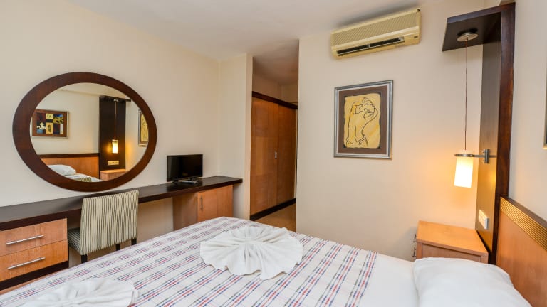 In den Zimmern sind Klimaanlage, Heizung, ein Balkon sowie ein Safe vorhanden. Zu den weiteren Annehmlichkeiten zählen ein Telefon, ein Fernseher und kostenloses WLAN. Die Badezimmer sind mit Duschen und Haartrocknern ausgestattet. Es werden Familien- und Nichtraucherzimmer angeboten.