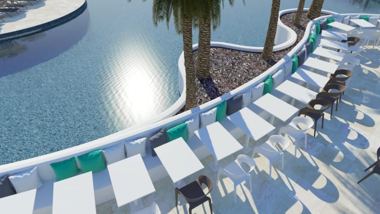 Der Speisesaal im Hotel bietet Buffet. Es gibt auch ein Café am Pool und eine Bar, L'Agora, die über eine große Terrasse mit Blick auf den Pool-Bar umfasst.