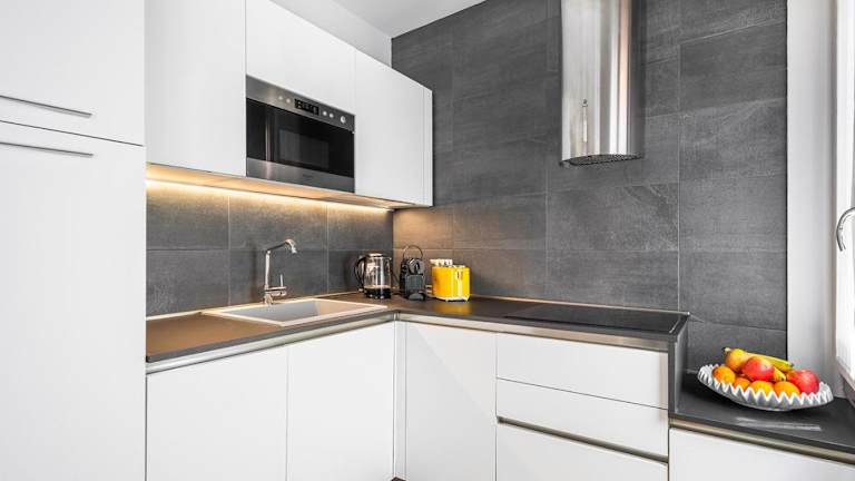 Die Unterkunft ist mit einer voll ausgestatteten Küche ausgestattet. Dazu gehören ein Kühlschrank, Geschirrspüler, Ofen, Kaffeemaschine und Wasserkocher für die Selbstverpflegung.