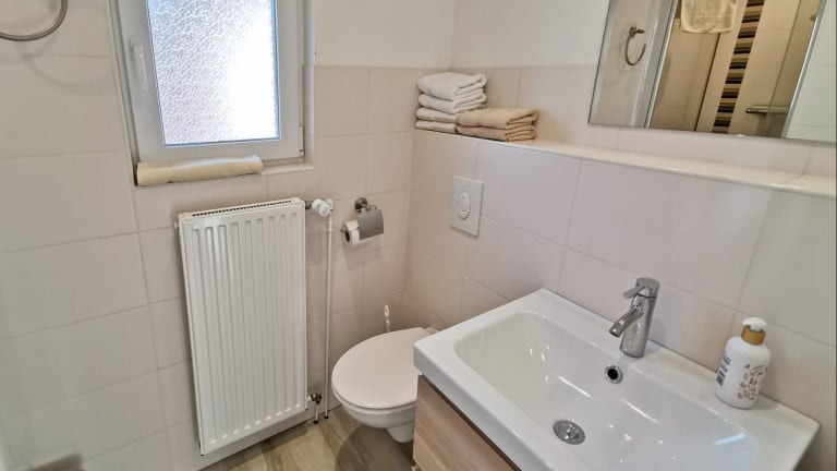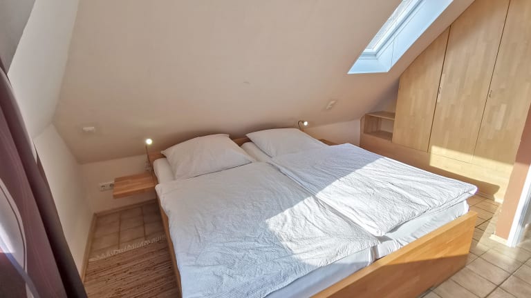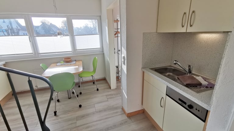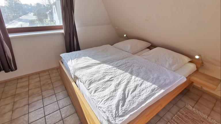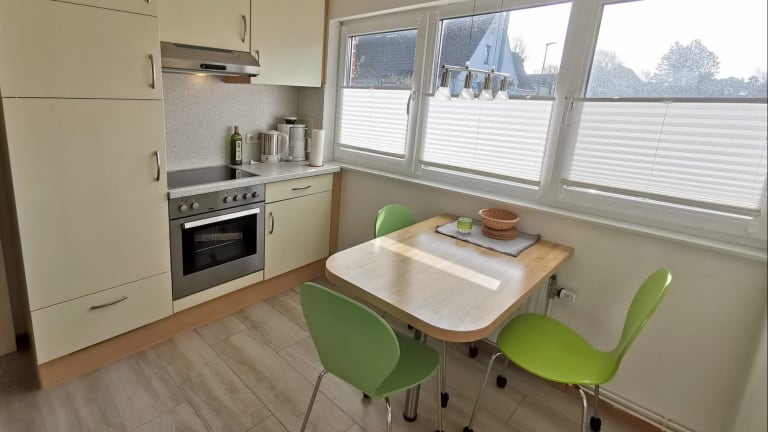 Im Erdgeschoss ein Raum mit gemütlicher Sitzecke, Küchenteil und Esstisch, Flur mit Garderobe und Bad. Im Obergeschoss zwei Schlafräume. Im Doppelzimmer ein großes Bett mit bequemer Ein- und Ausstiegshöhe, dazu eine Leseecke mit gemütlichen Sesseln. Im Einzelzimmer ist eine kleine “Lesehöhle” -hier kann man sich zwischen die Kissen kuscheln und lesen oder träumen. Die Küche ist vollständig ausgestattet, so dass man seine Kochwünsche – wenn man will – auch verwirklichen kann (4fach-Ceranfeld, Backofen, Spülmaschine, Kühl-Gefrierschrank, Toaster, Wasserkocher). Die eigene Terrasse mit Strandkorb ist direkt vor dem Haus und mit sehr gutem Sichtschutz versehen. Flachbild-TV, Stereoanlage, WLAN kostenlos.