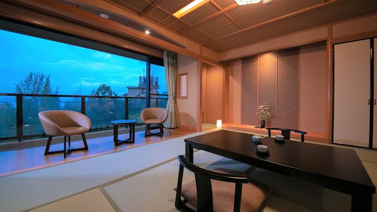 Die Zimmer sind sowohl im japanischen Stil mit Tatamiböden und Futonbetten als auch in westlichem Stil mit Betten und Sofa ausgestattet. Für ein angenehmes Raumklima in den schallisolierten Zimmern sorgen Klimaanlage und Heizung. Viele Zimmer bieten zusätzlich einen Balkon. Zur Ausstattung gehören ein Flachbild-TV, ein Kühlschrank und ein eigenes Bad mit Dusche, Badewanne und Bidet. Haartrockner und Kosmetikartikel sind ebenfalls vorhanden.