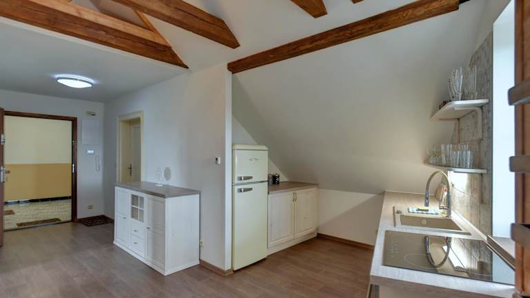 Das Apartmá umfasst zwei Schlafzimmer, ein Wohnzimmer mit einem Flachbild-TV, eine Küche und ein Badezimmer mit Dusche sowie kostenlosen Pflegeprodukten.