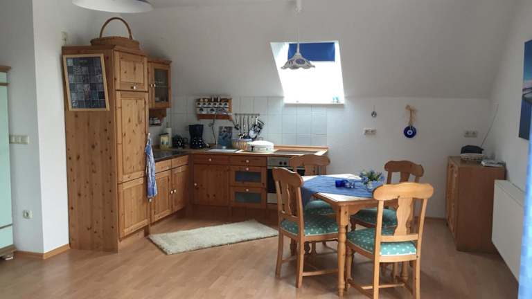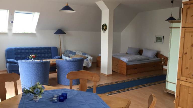 Das Hotel Blauer Salon bietet ein Apartment mit einem Schlafzimmer und einem Badezimmer. Das Apartment ist gemütlich eingerichtet und verfügt über eine voll ausgestattete Küchenzeile, einen Essbereich und einen Balkon mit Blick auf den Garten. Bettwäsche und Handtücher werden gestellt. Ein Flachbild-Sat-TV steht ebenfalls zur Verfügung.