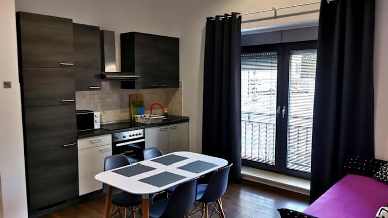 Die Ferienwohnung besteht aus 1 Schlafzimmer, einem Wohnzimmer und einer voll ausgestatteten Küche mit Kühlschrank und Kaffeemaschine. Ein Badezimmer mit Badewanne und Haartrockner ist ebenfalls vorhanden. Handtücher und Bettwäsche werden bereitgestellt. Die Zimmer sind schallisoliert und bieten Zugang über einen Schlüssel.