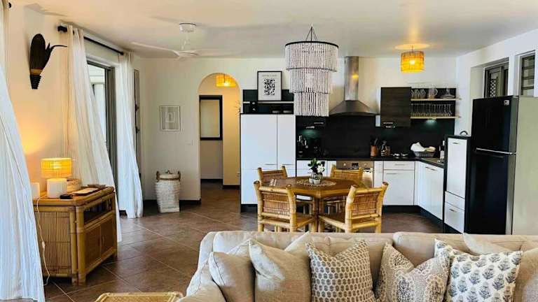Die Villa umfasst zwei Schlafzimmer und bietet eine gut ausgestattete Küche mit Kühlschrank und Geschirrspüler. Weiterhin stehen ein Flachbild-TV, ein Sitzbereich und zwei Badezimmer mit Dusche zur Verfügung. Handtücher und Bettwäsche sind ebenfalls vorhanden.