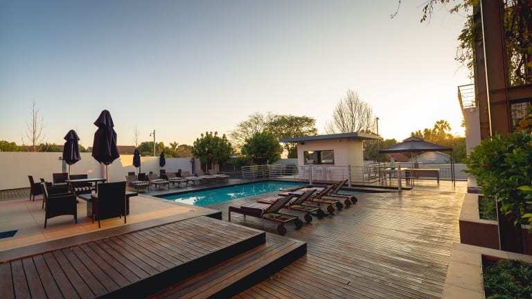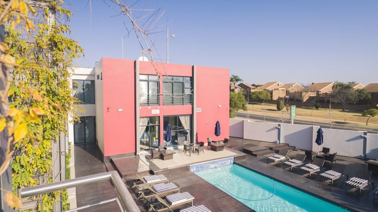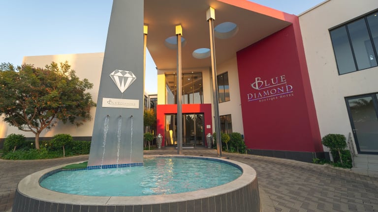 Das Blue Diamond Boutique Hotel in Moreleta Park, Pretoria, bietet Ihnen einen erholsamen und komfortablen Aufenthalt. Genießen Sie den kostenfreien Zugang zum Pool, Fitnesscenter und Dampfbad. Die klimatisierten Zimmer sind stilvoll eingerichtet und verfügen über moderne Annehmlichkeiten. Das hoteleigene Restaurant serviert köstliche Mahlzeiten und an der Poolterrasse können Sie bei einem Drink entspannen. Die Umgebung bietet zahlreiche Attraktionen, darunter Naturschutzgebiete und historische Sehenswürdigkeiten. Kostenfreies WLAN und Parkplätze stehen zur Verfügung.