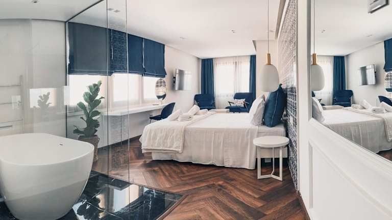Die BLUE LUXURY SUITES bieten eine Terrasse, Nichtraucherzimmer und kostenloses WLAN in der gesamten Unterkunft. Die Einrichtung umfasst einen Kleiderschrank in jedem Zimmer, zusätzliche Annehmlichkeiten wie einen Schreibtisch, Klimaanlage und Flachbild-TV, wobei einige Zimmer auch über einen Balkon verfügen. Die Ausstattung beinhaltet Bettwäsche und Handtücher.