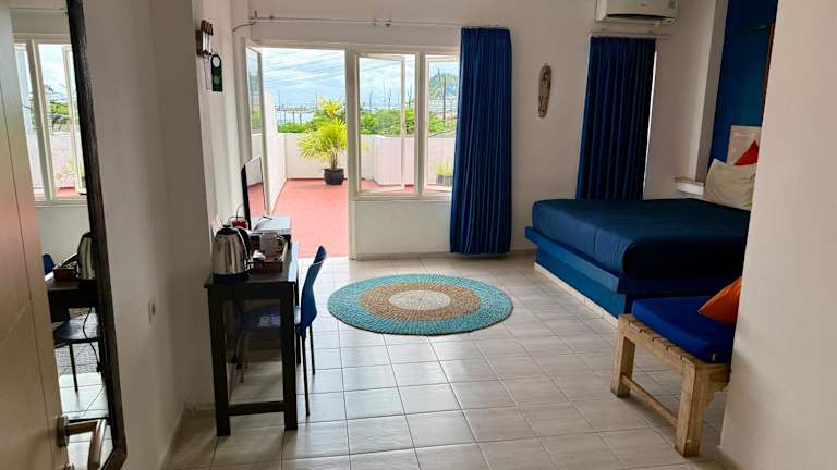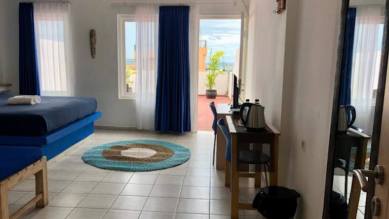 Das Blue Ocean Hotel verwöhnt Sie mit einem köstlichen amerikanischen Frühstück, das Ihnen den perfekten Start in den Tag bietet. Außerdem können Sie sich in der Bar auf der Dachterrasse entspannen und dabei die Meeresbrise und den Blick auf den Hafen genießen. Hier können Sie auch eine Vielzahl von Getränken und Snacks genießen.