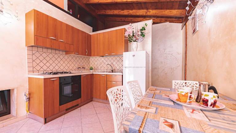 In der Unterkunft gibt es eine voll ausgestattete Küche mit Kühlschrank, Ofen und Herdplatte. Ein Essbereich ist ebenfalls vorhanden, wodurch ein selbstständiges Kochen und Essen möglich ist.