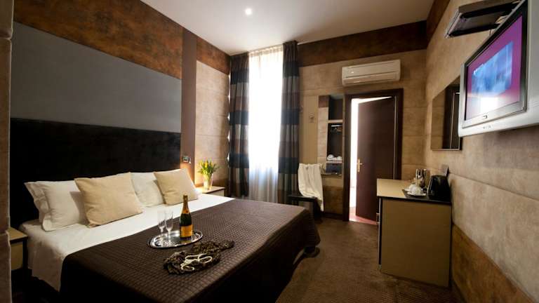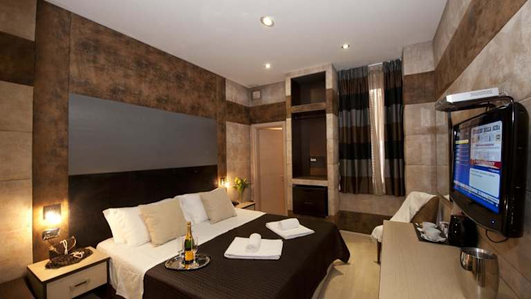 Die Zimmer im Hotel Blue Suite Vatican sind klimatisiert und bieten Ihnen eine komfortable und moderne Unterkunft. Jedes Zimmer verfügt über einen Flachbild-TV, auf dem Sie Ihre Lieblingssendungen und Filme genießen können. Das Badezimmer ist mit einer Badewanne oder Dusche ausgestattet und bietet Ihnen alle Annehmlichkeiten, die Sie für einen angenehmen Aufenthalt benötigen.