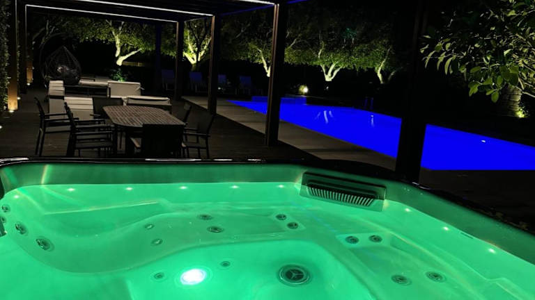 Die Villa umfasst fünf Schlafzimmer, ein Wohnzimmer und eine modern ausgestattete Küche mit Kühlschrank und Kaffeemaschine. Zudem sind drei Badezimmer mit Dusche und Whirlpool vorhanden. Handtücher und Bettwäsche werden bereitgestellt.