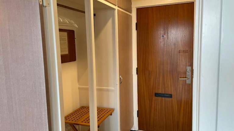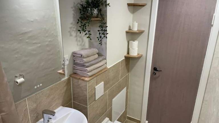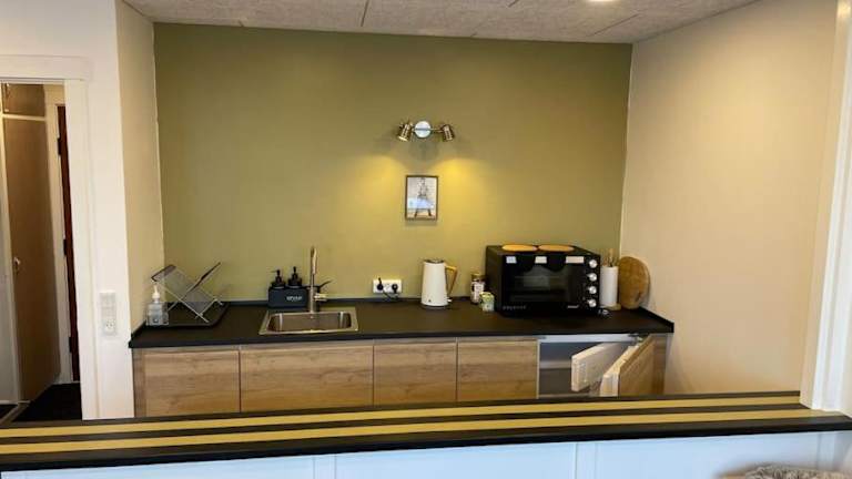 Die Wohnung verfügt über eine Küchenzeile mit einem Kühlschrank und einem Ofen, wodurch die Möglichkeit besteht, eigene Mahlzeiten zuzubereiten.