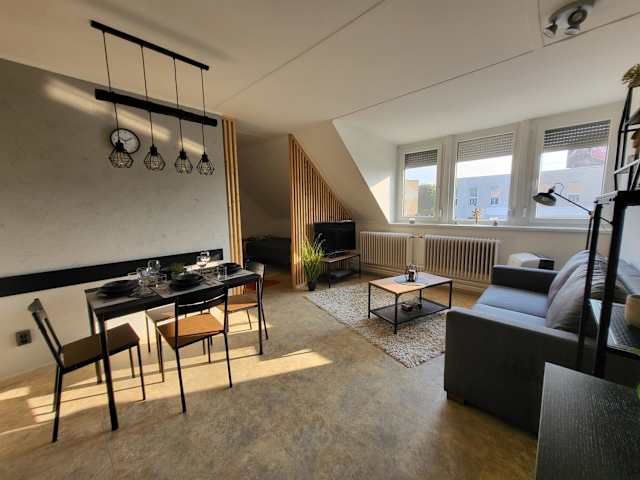 Die Ferienwohnung besteht aus 1 Schlafzimmer, einem Wohnzimmer und einer voll ausgestatteten Küchenzeile, die mit einem Kühlschrank und einer Kaffeemaschine ausgestattet ist. Es gibt ein Badezimmer mit einer Dusche und einem Haartrockner. Handtücher und Bettwäsche werden bereitgestellt.