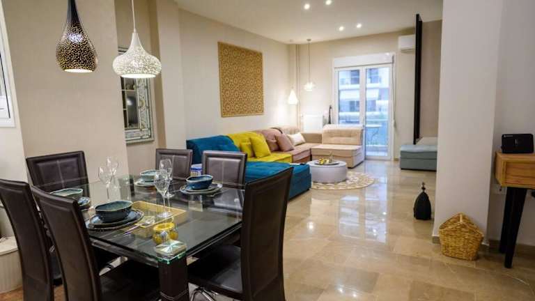 Boho 2 bdr luxury meets the East bietet komfortable Übernachtungsmöglichkeiten in Form einer Ferienwohnung, die mit Annehmlichkeiten wie Klimaanlage, kostenlosem WLAN und einem Balkon ausgestattet ist. Die Ferienwohnung verfügt über zwei Schlafzimmer und eine modern ausgestattete Küche.