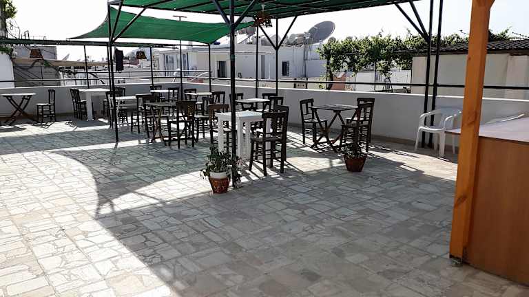 Auf der Terrasse des Hotels können Sie das schöne Wetter genießen und sich entspannen.