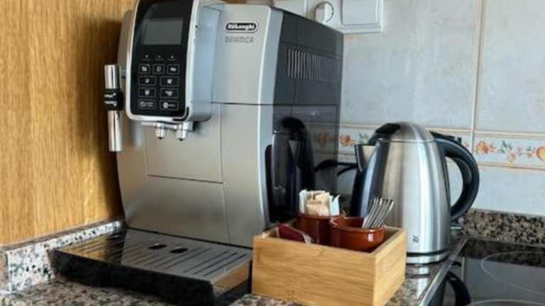 Die Ferienwohnung ist mit einer voll ausgestatteten Küche ausgestattet, die unter anderem einen Kühlschrank und eine Kaffeemaschine umfasst. Verpflegungsmöglichkeiten sind nicht näher beschrieben.