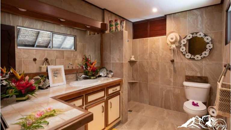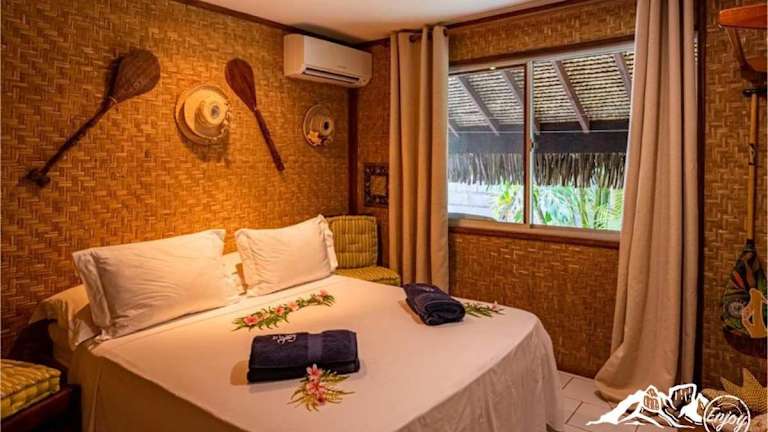 Die Villa Bora Bora - on Matira bietet Ihnen ein komfortables und stilvolles Ambiente für Ihren Aufenthalt. Die klimatisierte Villa verfügt über zwei Schlafzimmer, in denen Sie sich nach einem erlebnisreichen Tag entspannen können. Das Wohnzimmer lädt zum Verweilen ein und die voll ausgestattete Küche ermöglicht es Ihnen, Ihre eigenen Mahlzeiten zuzubereiten. Das Badezimmer ist mit einer Dusche ausgestattet. Kostenloses WLAN steht Ihnen in der Villa zur Verfügung, so dass Sie jederzeit mit Ihren Lieben in Kontakt bleiben können.