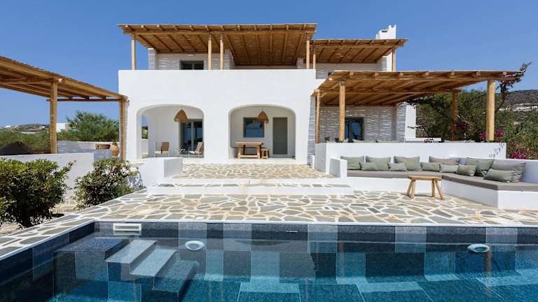 Bougainvillea House Antiparos - Private Pool Villa ist eine Unterkunft, die einen Außenpool, einen Garten und eine Terrasse bietet. Es handelt sich um ein Ferienhaus, das sorgt für Privatsphäre und Entspannung mit einem eigenen Pool sowie kostenlosem WLAN und Meerblick.