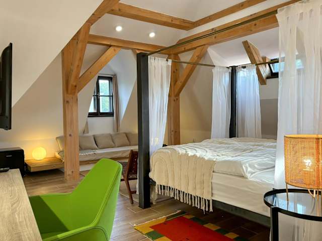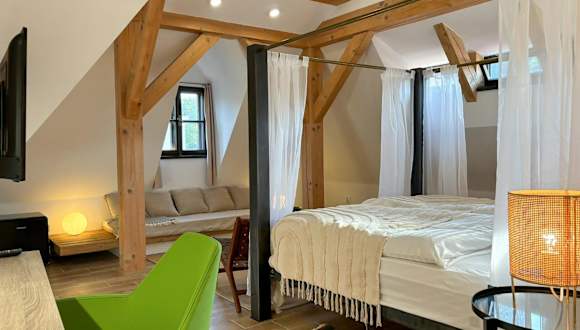 Die Unterkunft befindet sich in Český Krumlov, in der Nähe des Hauptplatzes sowie des Schlosses Krumau. Weitere wichtige Punkte in der Umgebung sind das Drehende Amphitheater und die Bushaltestelle sowie der Bahnhof in České Budějovice, beide ca. 27 km entfernt.