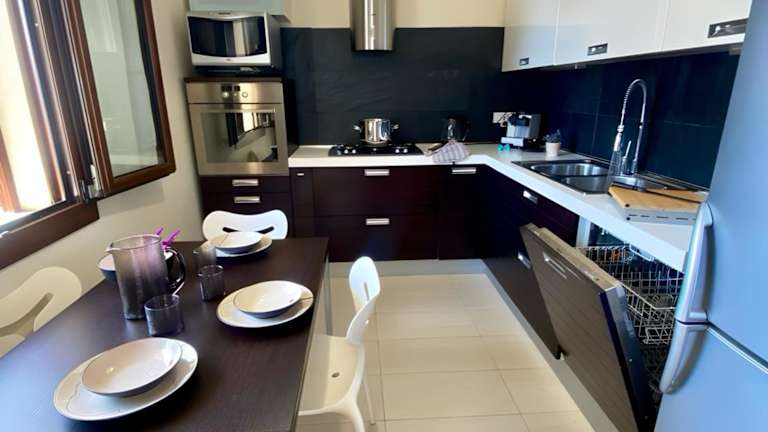 In der voll ausgestatteten Küche des Ferienhauses können Sie Ihre eigenen Mahlzeiten zubereiten und auf der Terrasse oder dem Balkon mit Meerblick genießen. Alternativ können Sie auch eines der nahegelegenen Restaurants besuchen und die lokale Küche probieren.