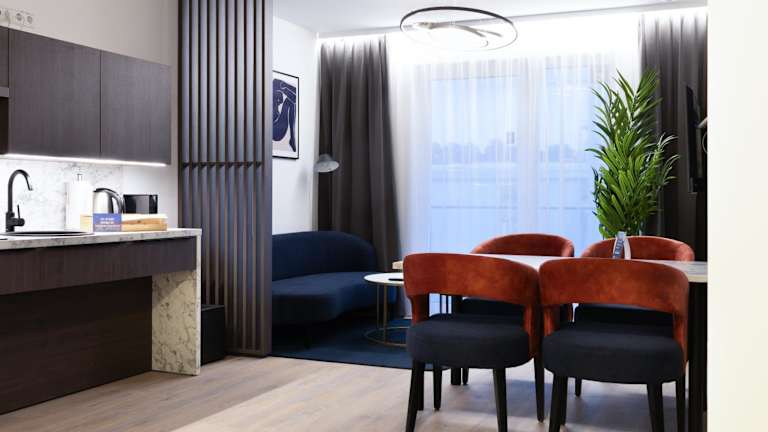 Die Wohneinheiten sind mit einem Flachbild-TV, einem Sitzbereich, einer voll ausgestatteten Küche mit Kühlschrank, Geschirrspüler, Mikrowelle, Herdplatte, Toaster, Kaffeemaschine und Wasserkocher sowie einem eigenen Badezimmer mit Dusche und kostenlosen Pflegeprodukten ausgestattet.
