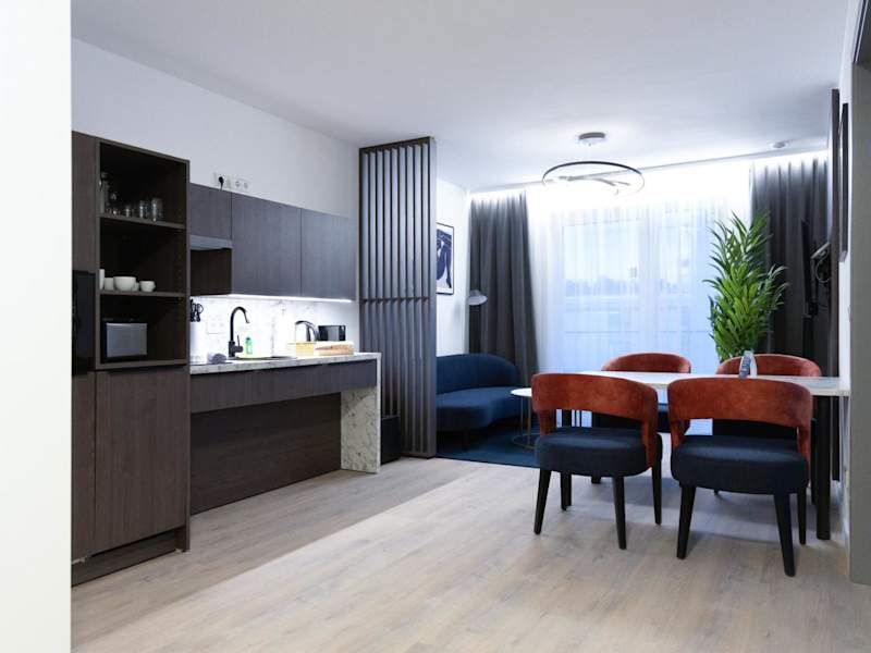 Die Zimmer sind mit einem Flachbild-TV, einem Sitzbereich, einer voll ausgestatteten Küche mit Kühlschrank, Geschirrspüler, Mikrowelle, Herdplatte, Toaster, Kaffeemaschine und Wasserkocher ausgestattet. Zudem verfügen die Zimmer über ein eigenes Badezimmer mit Dusche und kostenlosen Pflegeprodukten sowie eine Terrasse mit Stadtblick.